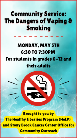 The Healthy Libraries Program (HeLP) and Stony Brook Cancer Center Office for Community Outreach and Engagement have partnered to provide cancer education. This presentation for teens and their parents will focus on the dangers of vaping, tobacco use, and explore risk factors for lung cancer.