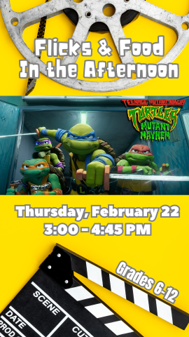 Join us in Teen Central for an afternoon of pizza and the movie Teenage Mutant Ninja Turtles: Mutant Mayhem. This movie is rated PG.