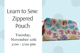 Learn to sew a zippered pouch to hold your pencils, makeup, small trinkets, dice, etc. Minimal sewing experience required. Nonrefundable fee: $5 check, money order, or credit card.