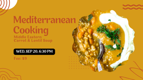 Chef Naela from Naela's Mediterranean Kitchen will demonstrate how to make Middle Eastern carrot and lentil soup with a dukka mild spice blend. It will be served a with zaatar and olive oil bread and a middle eastern salad, followed by layali lubnan semolina dessert with rose water and simple syrup.