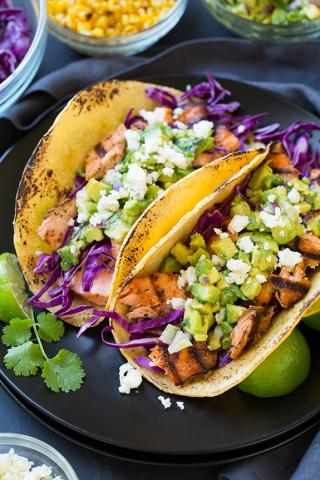 Today's menu: Grilled salmon tacos with avocados and yellow peppers. Chicken piccata meatballs over egg noodles. Spring lemon cake with crumb topping and lemon glaze.