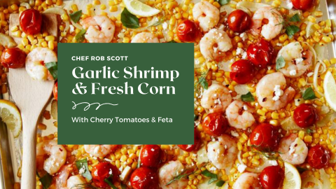 Join Chef Rob live on our Facebook page as he demonstrates how to make Garlic Shrimp and Fresh Corn with Tomatoes and Feta!