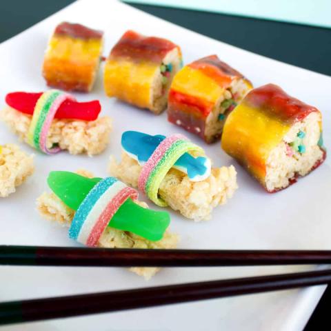 Looks like sushi but tastes like candy! Craft your own sushi-inspired dessert out of Rice Krispie Treats and gummy candy.