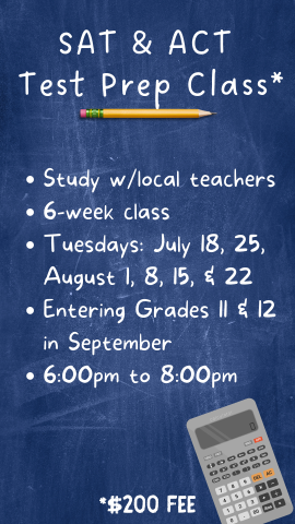 Study with local teachers Ms. Gennosa and Mr. Berman for this in-person, 6-week SAT and ACT Test Prep class. ELA and Math covered. The total fee is $200 cash, due on the first day. Test materials will be provided. The class will be on Tuesdays, July 18, 25, August 1, 8, 15, & 22.