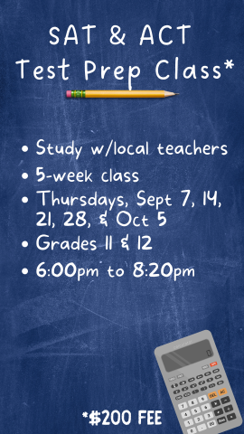 Study with local teachers Ms. Gennosa and Mr. Berman for this in-person, 5-week SAT and ACT Test Prep class. ELA and Math covered. The total fee is $200 cash, due on the first day. Test materials will be provided. The class will be on Thursdays, September 7, 14, 21, 28 & October 5 and will run for 2 hours and 20 minutes each week.