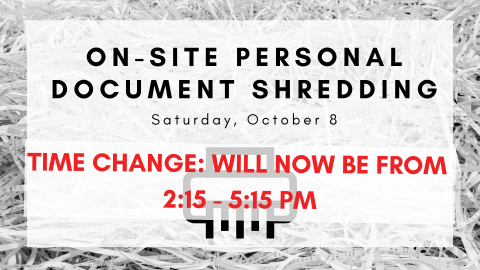 On-site Personal Document Shredding in our Greeley Avenue parking lot! Up to 3 bags or 3 boxes of documents. First come, first served. *IF YOU CAN'T MAKE THE NEW TIME, THERE WILL BE BINS SET UP FOR YOU TO LEAVE YOUR ITEMS TO BE SHREDDED BETWEEN 10:00 - 1:00*