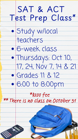 Study with local teachers Ms. Gennosa and Mr. Berman for this 6-week SAT and ACT Test Prep class. ELA and Math covered. Test materials will be provided. Please note there will be no class on October 31. The total fee is $200 cash, due on the first day.