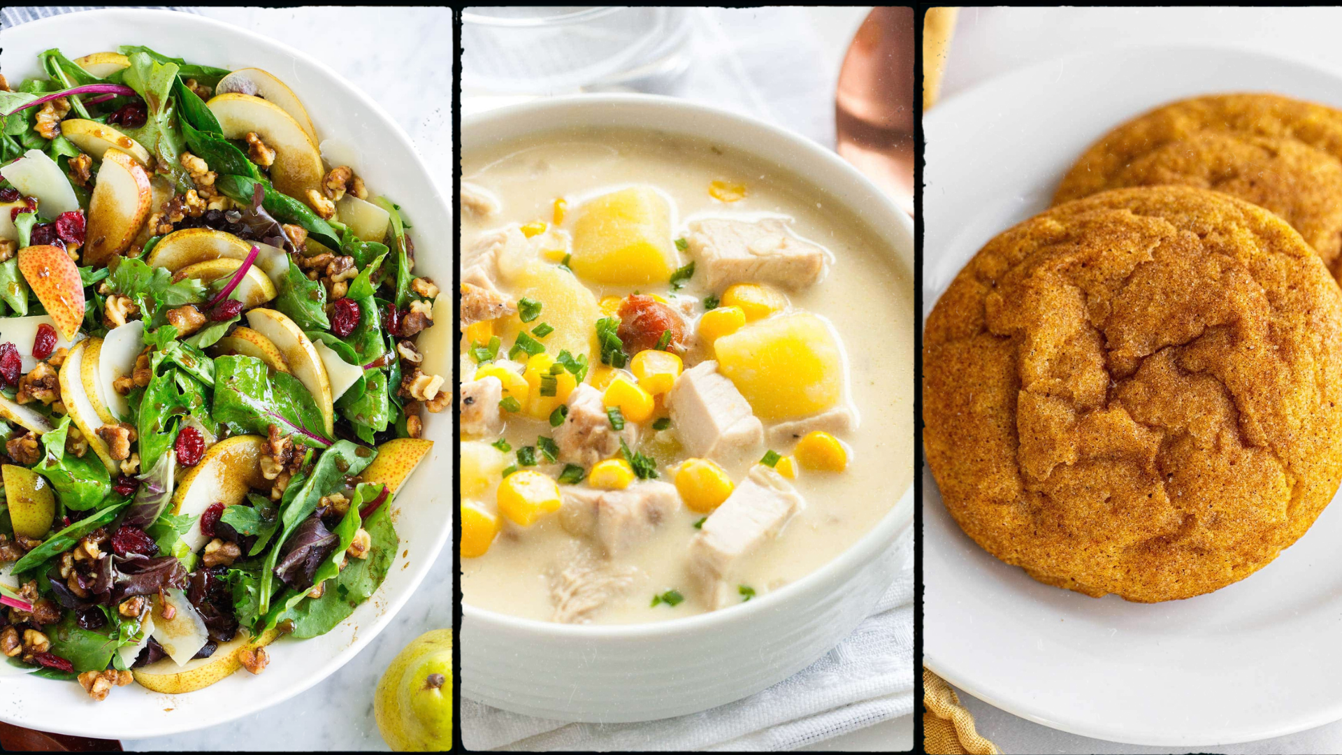 Today's Menu: Pear with mixed greens, dried cherries, and candied walnuts with a balsamic dressing. Turkey corn chowder. Pumpkin snickerdoodles.